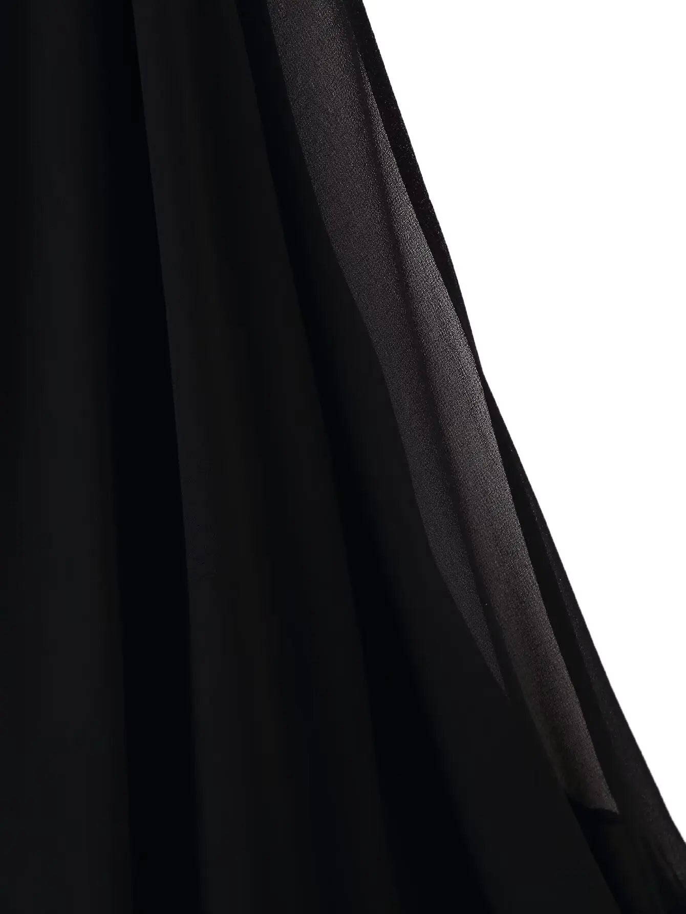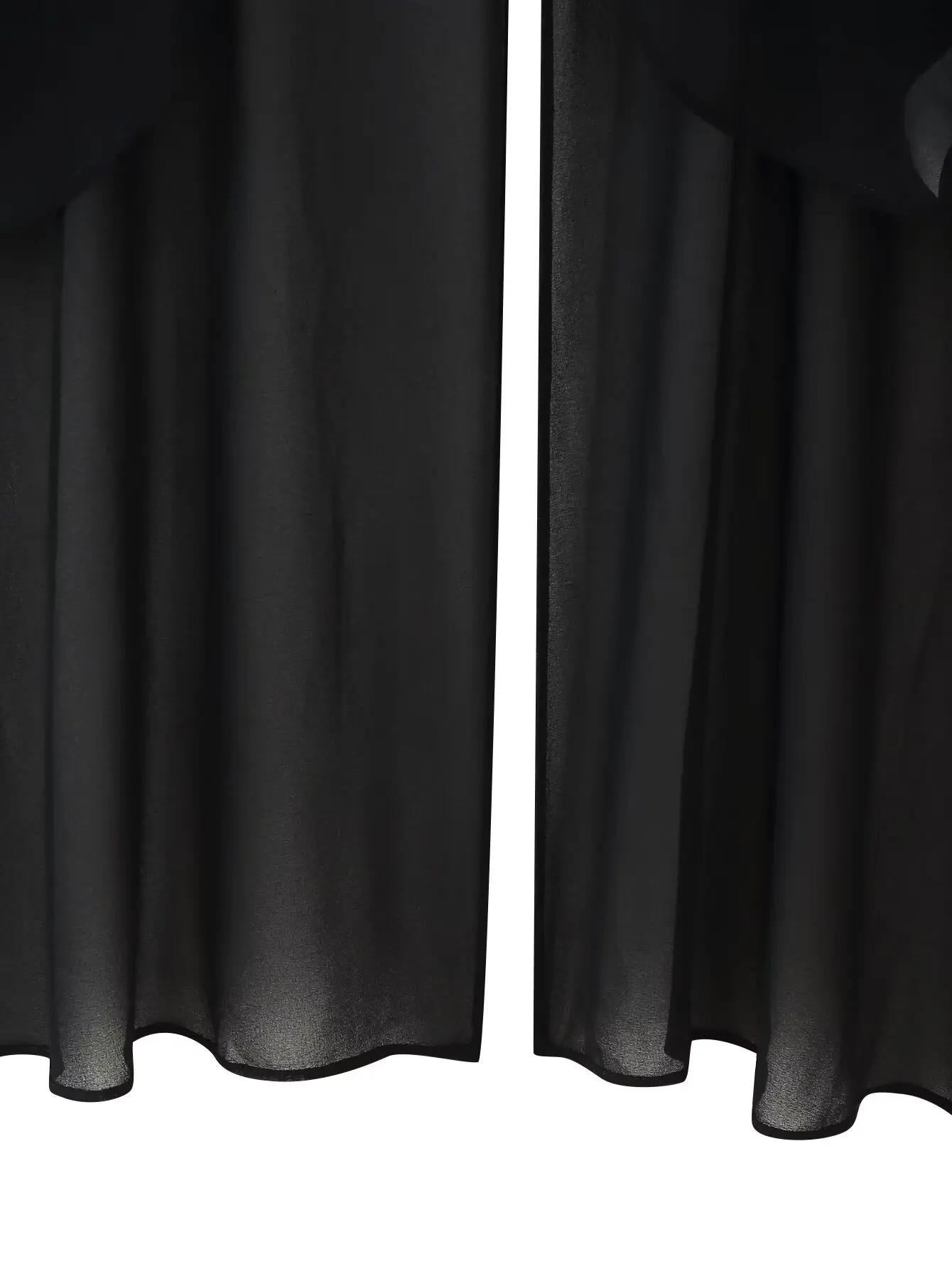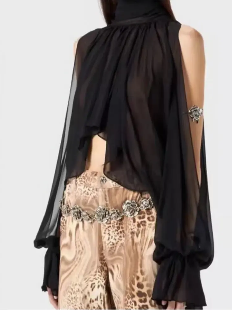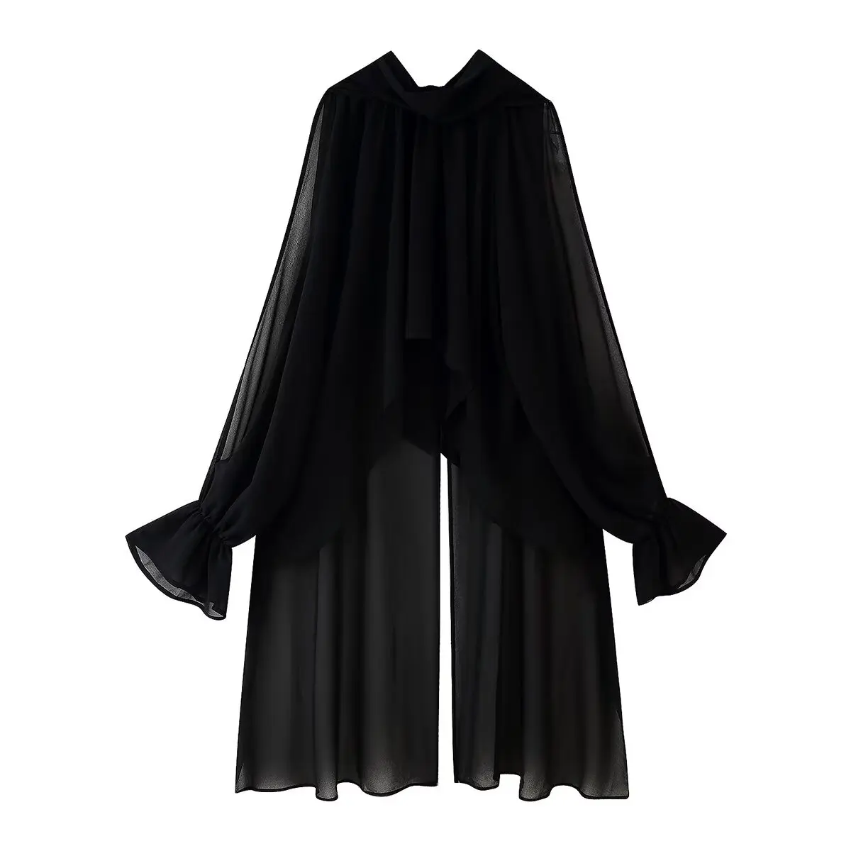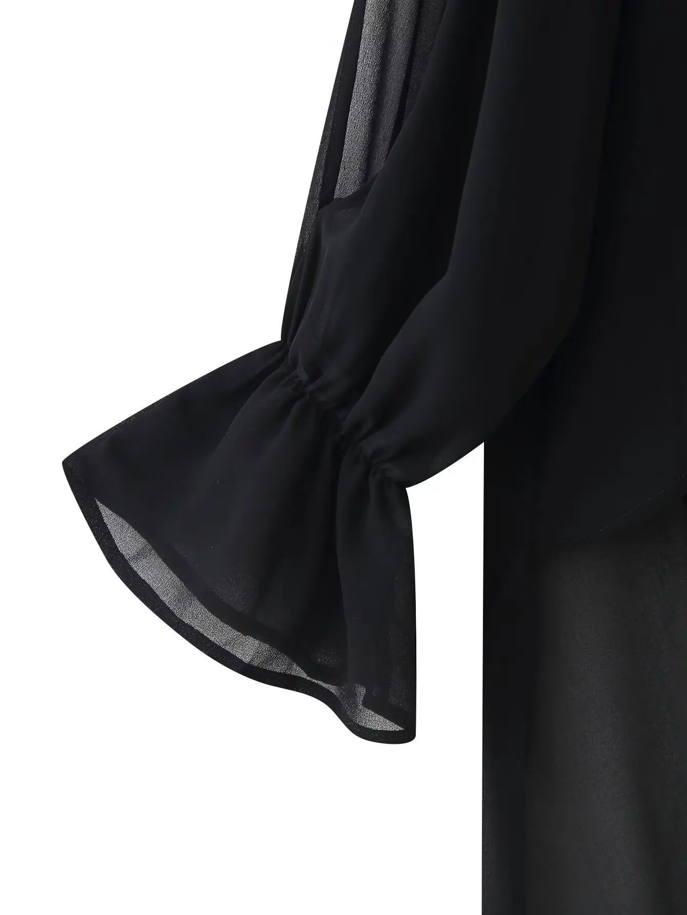 2025 Summer Women's Vintage Translucent Black Flare Sleeve Ruffles Tierred Shirts Lady Elegant Chiffon High Neck Layered Blouses