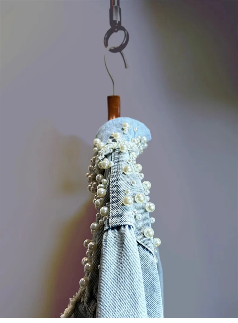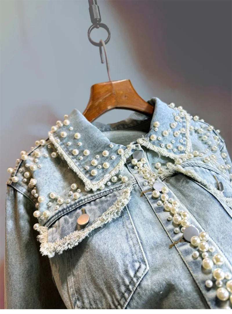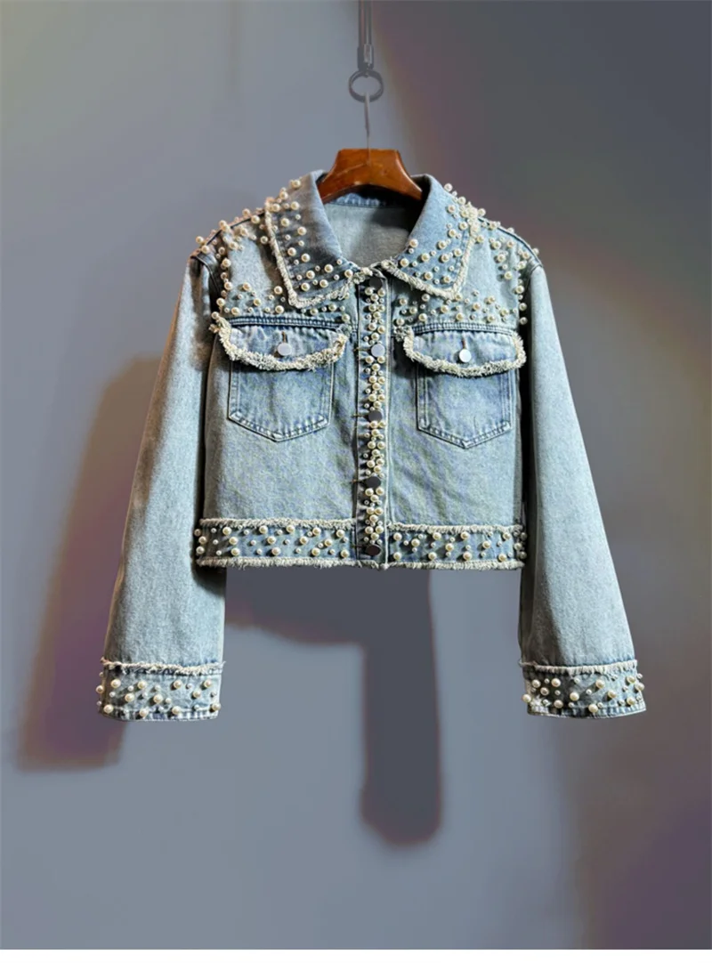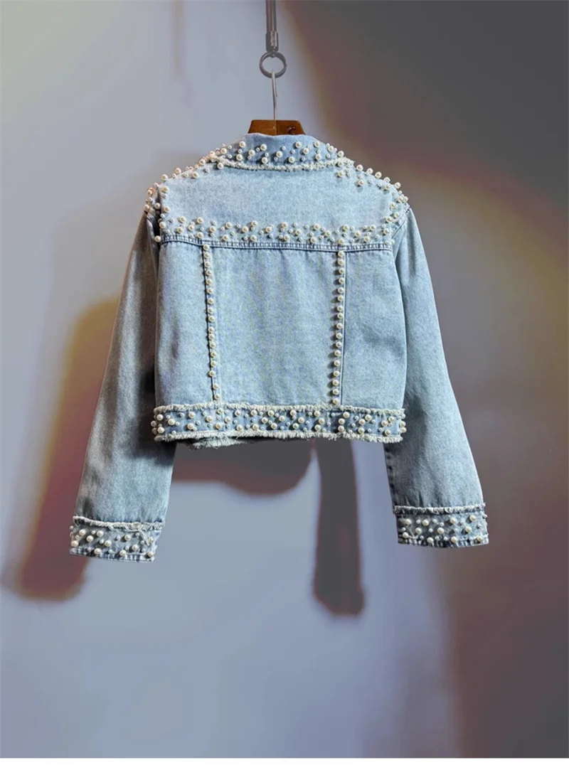 Autumn Women Vintage Light Blue Short Denim Jacket Pearl Beading Frayed Burrs Pocket Long Sleeve Jeans Jacket Coat Streetwear