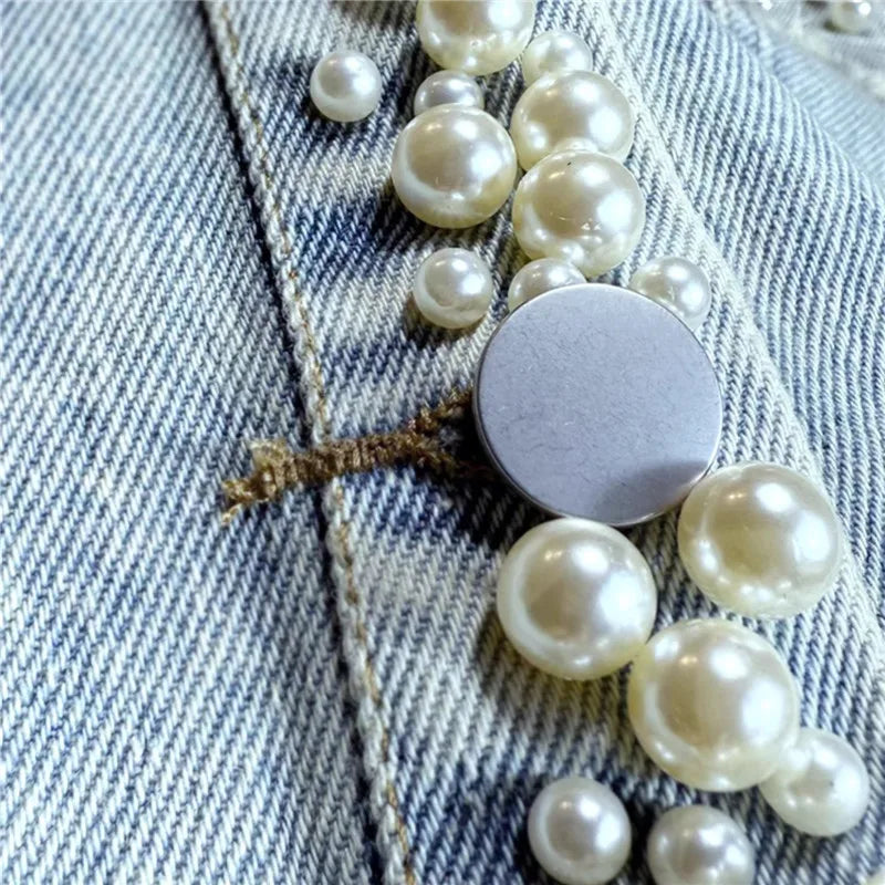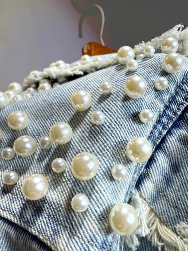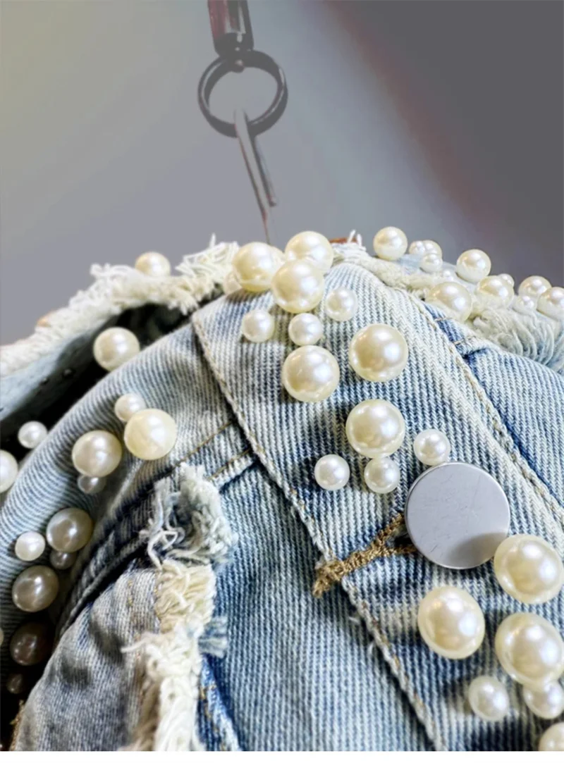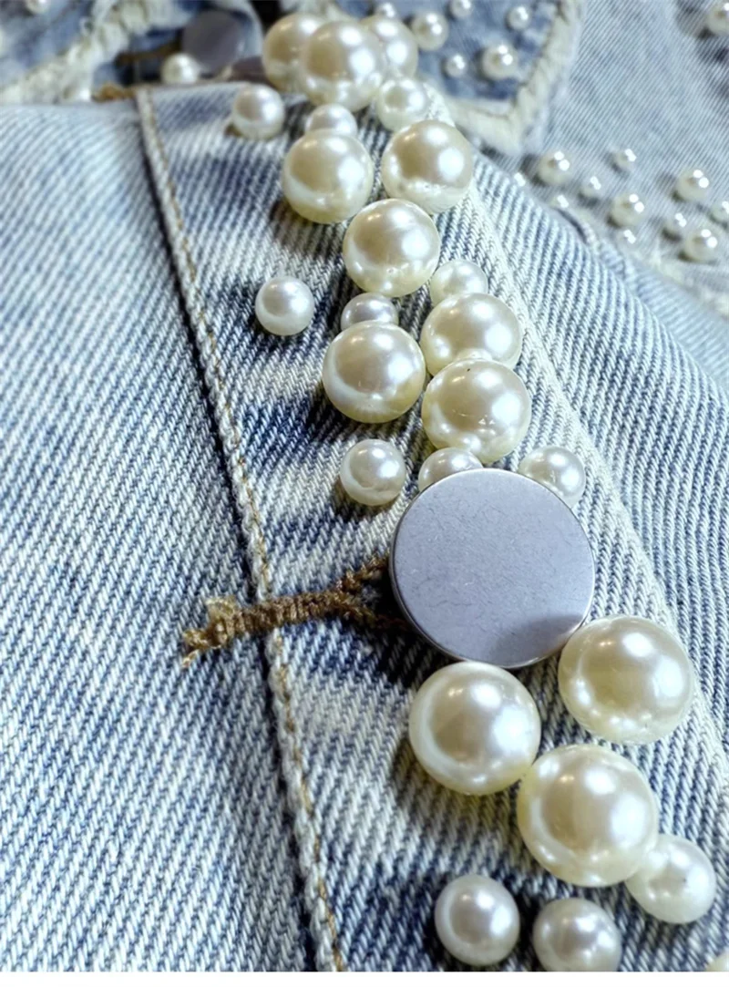 Autumn Women Vintage Light Blue Short Denim Jacket Pearl Beading Frayed Burrs Pocket Long Sleeve Jeans Jacket Coat Streetwear
