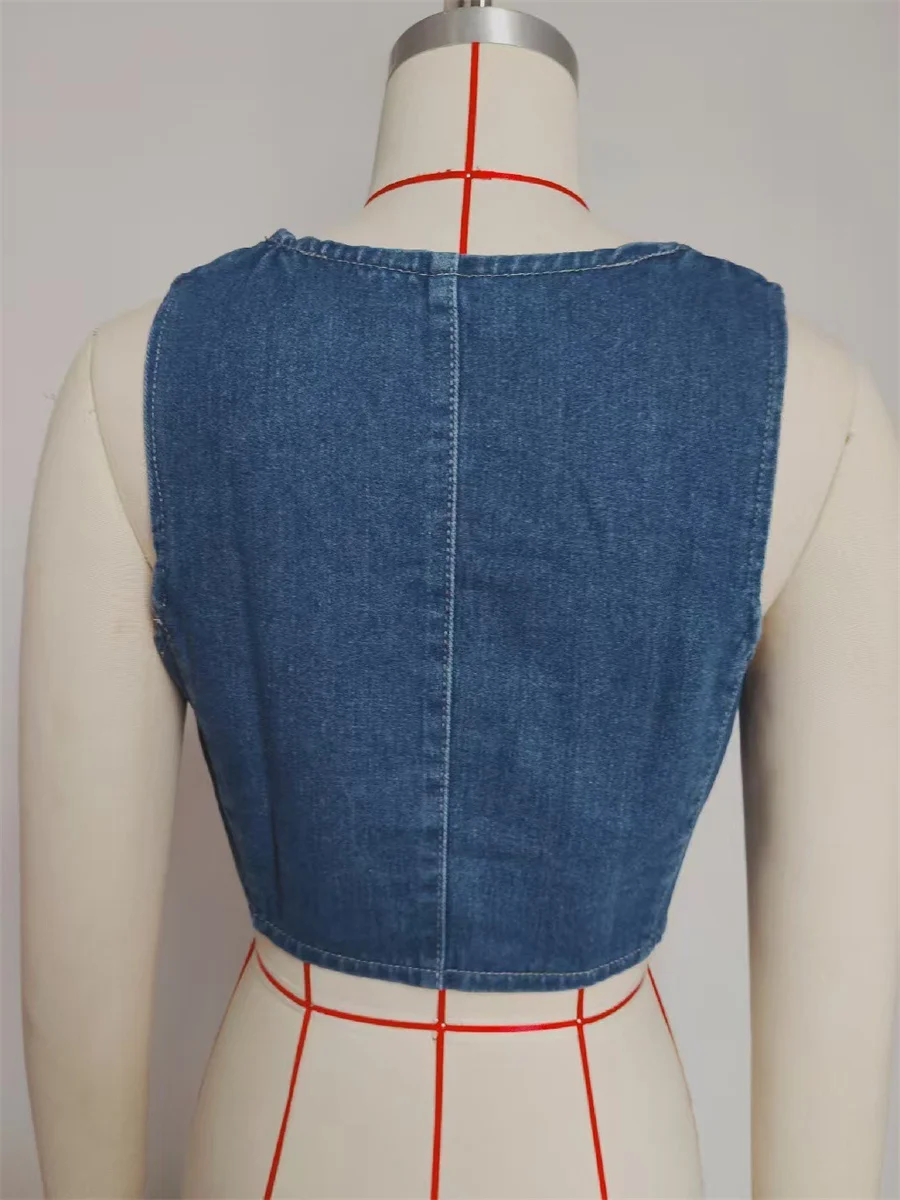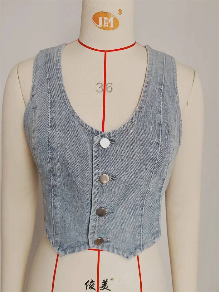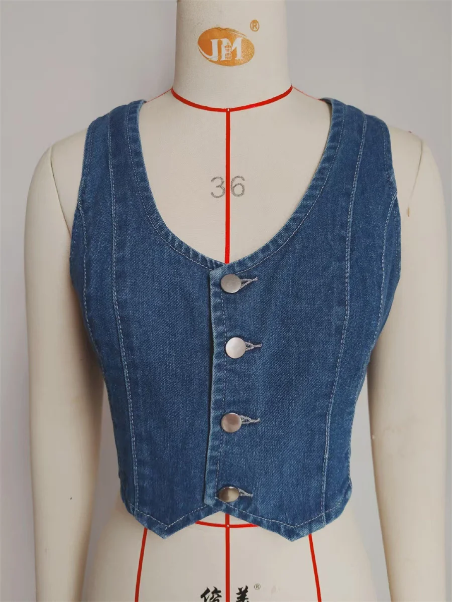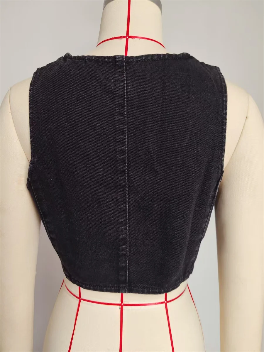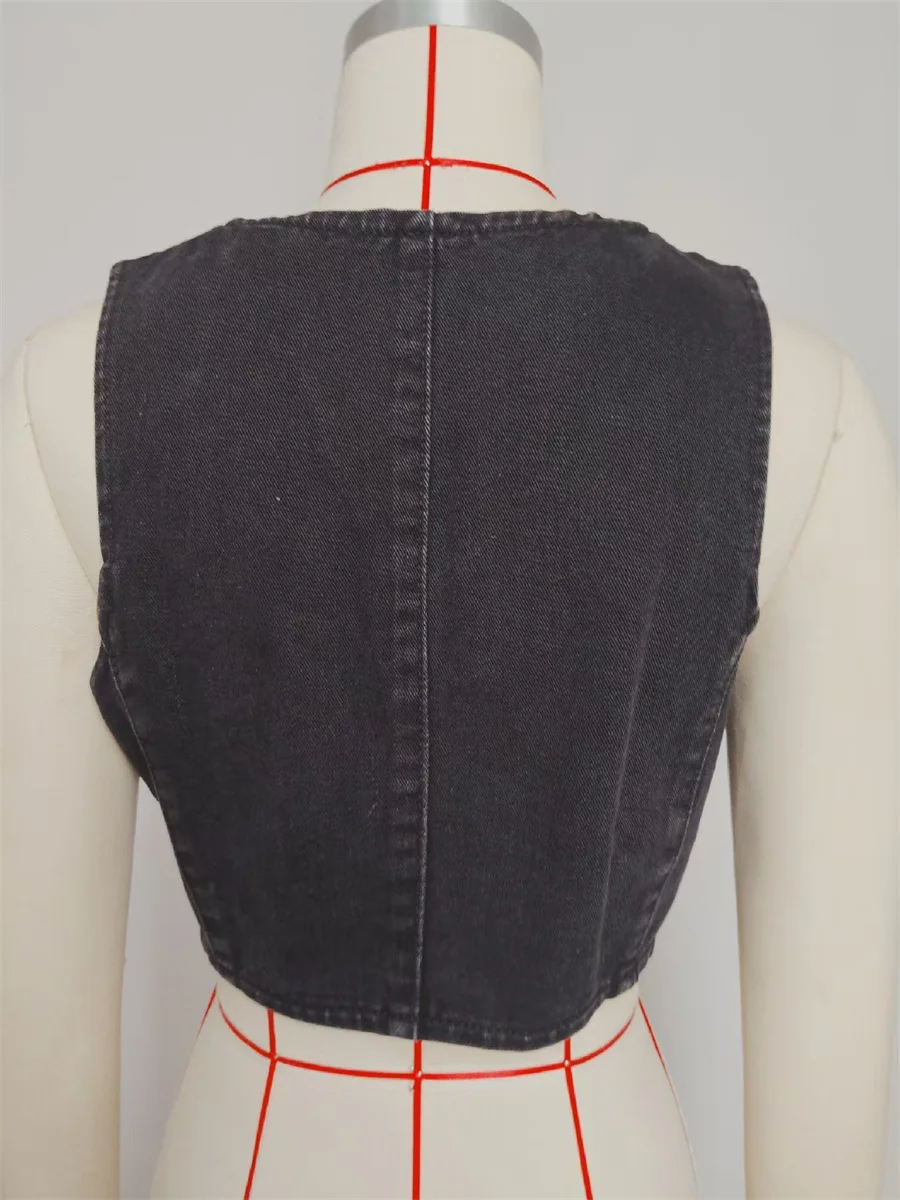 Benuynffy American Retro V-neck Sleeveless Denim Vest Women's Fashion Single Breasted Casual Streetwear Y2K Crop Jean Top