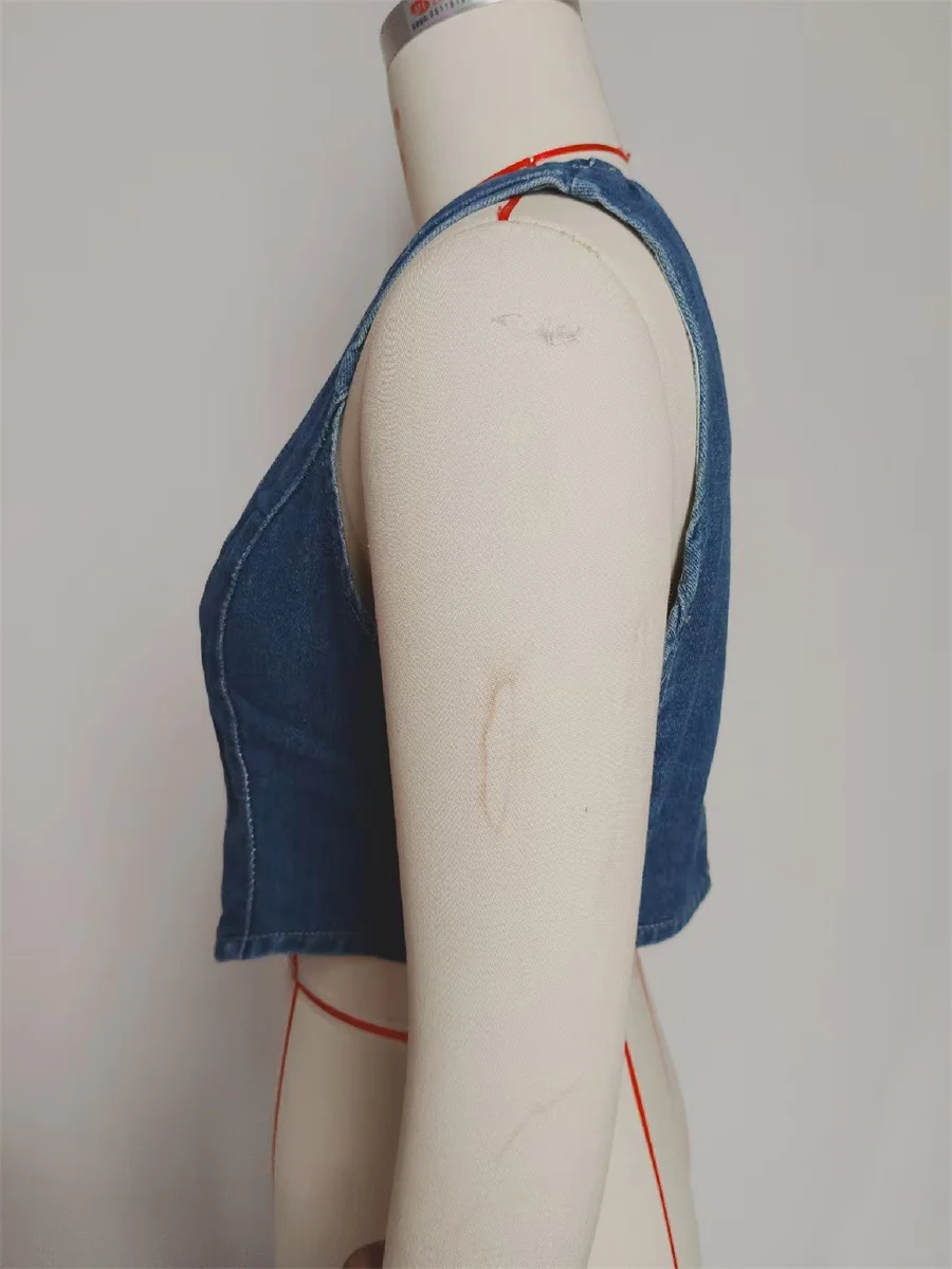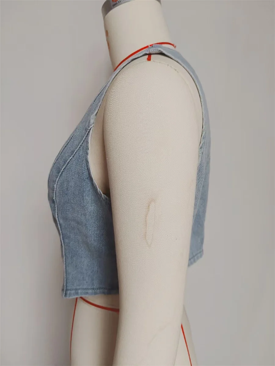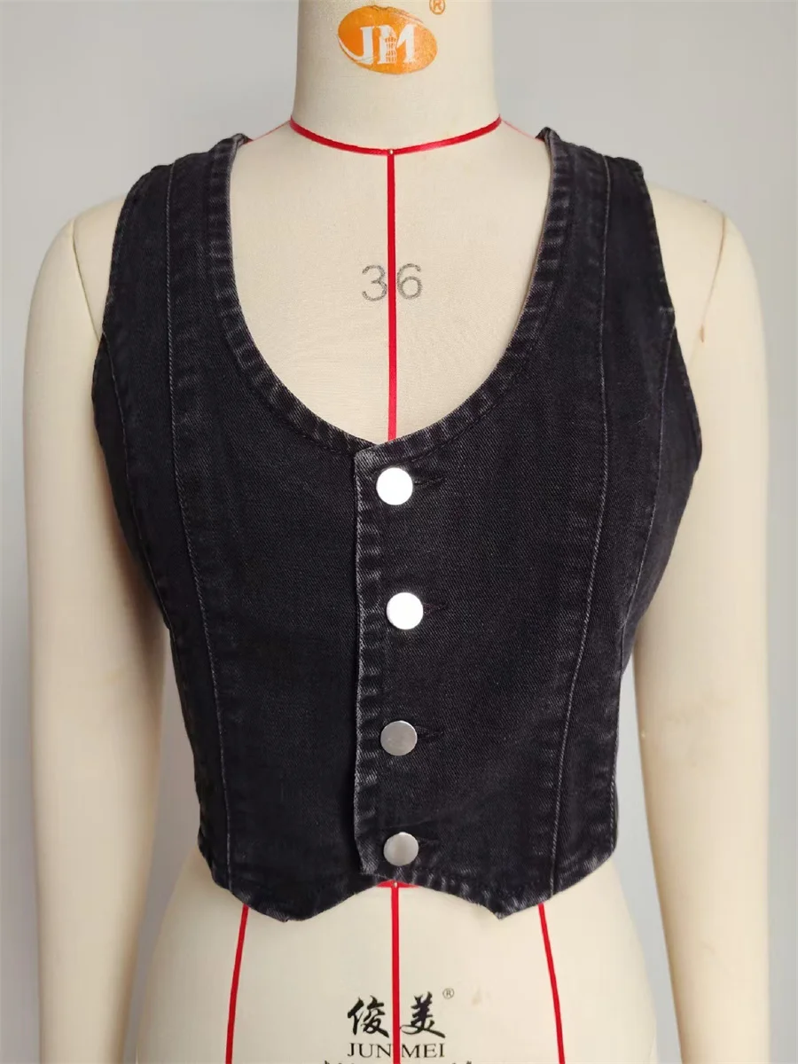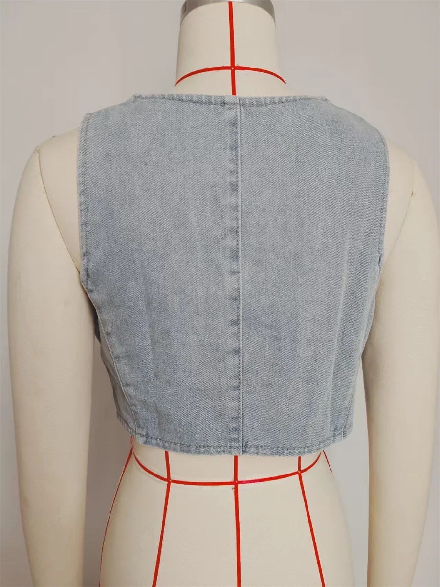 Benuynffy American Retro V-neck Sleeveless Denim Vest Women's Fashion Single Breasted Casual Streetwear Y2K Crop Jean Top