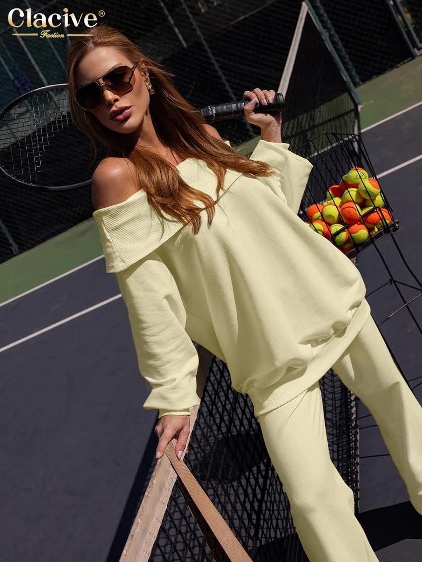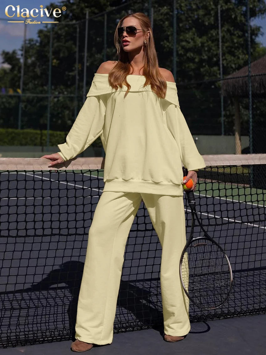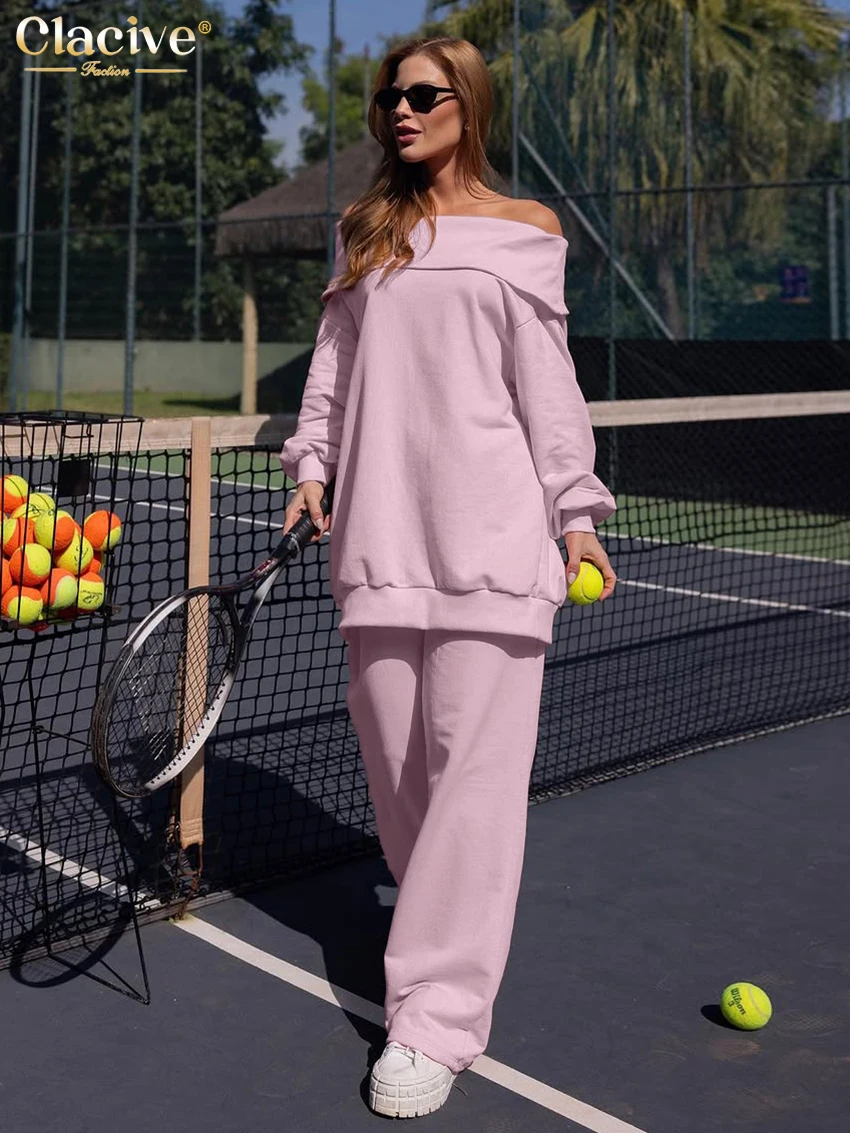 Clacive Fashion Loose Brown 2 Piece Set Women 2025 Winter Long Sleeve Shirt With High Waist Wide Pants Set Female Streetwear