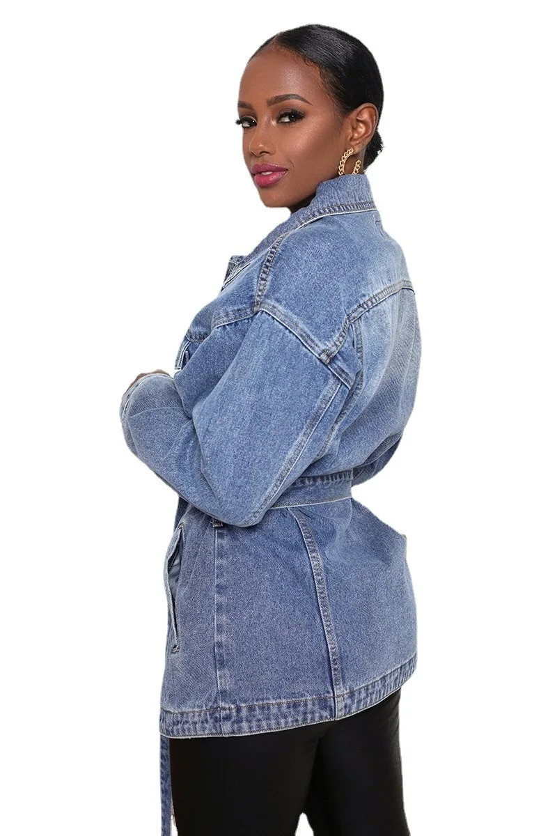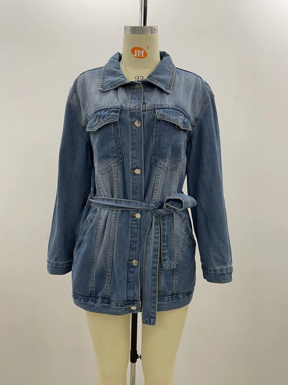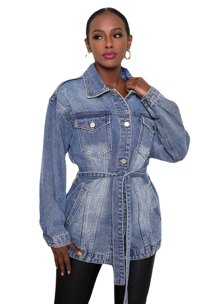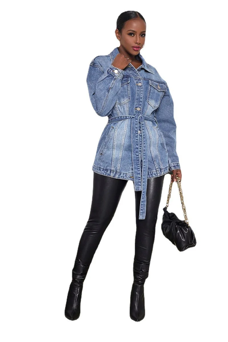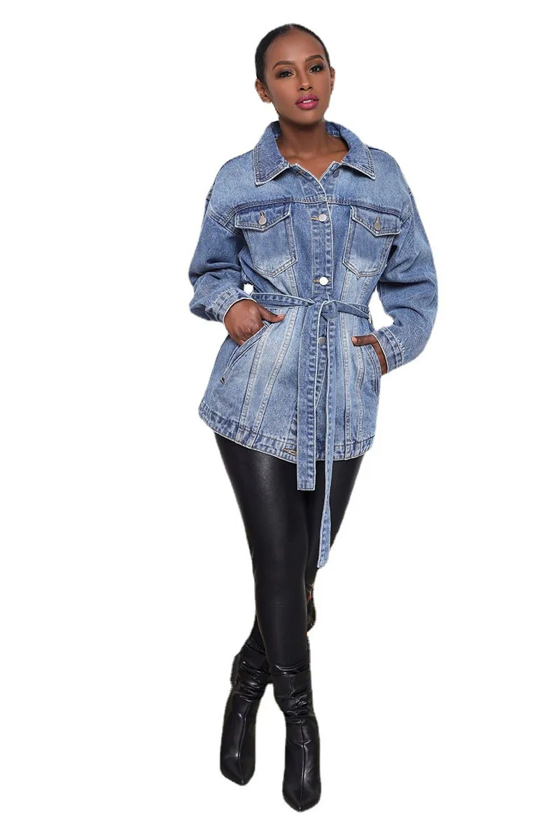 Denim Coat Women Mid Length Coats Turn Down Collar Y2k Jackets Open Stitch Lace Up High Waist Single Breasted Jackets Streetwear