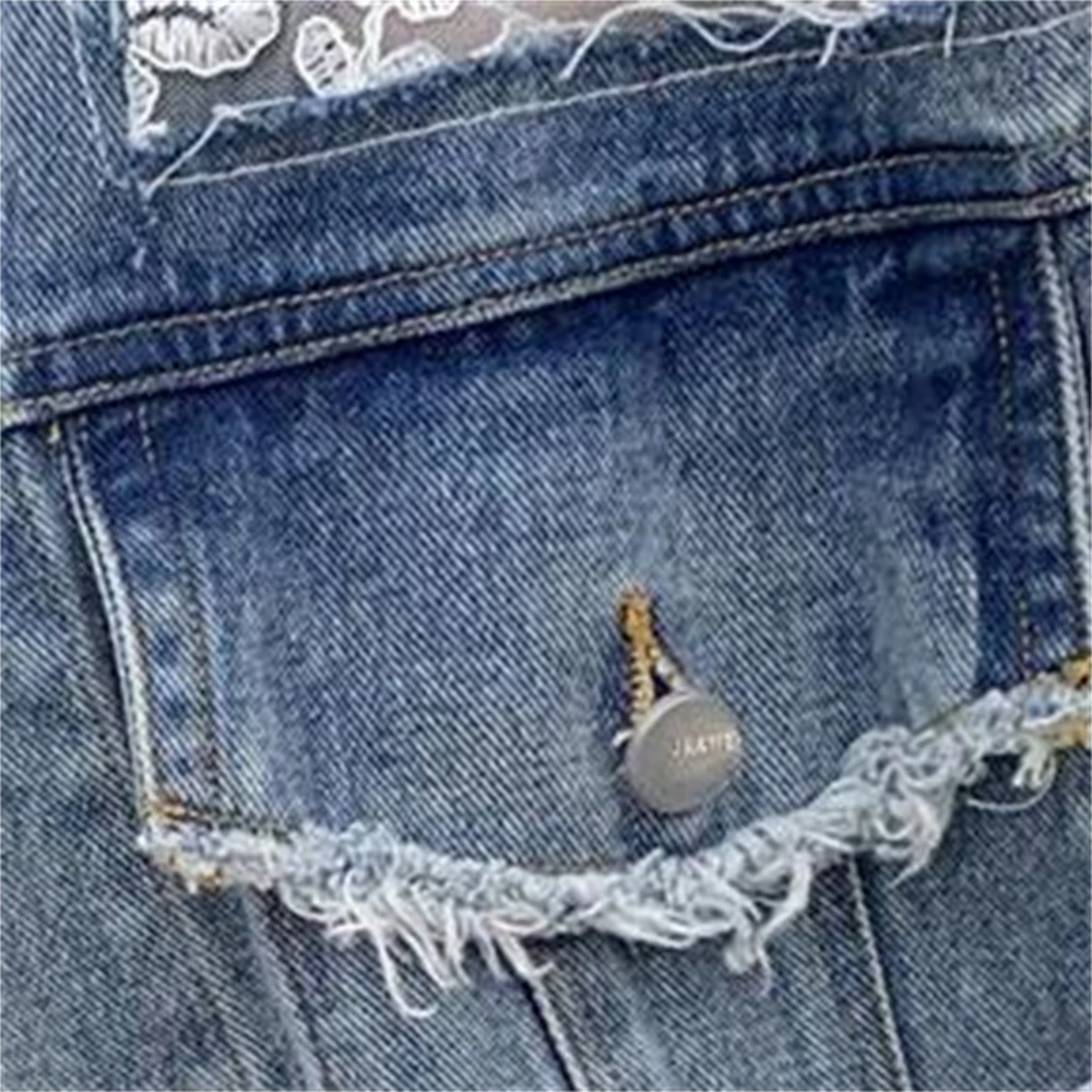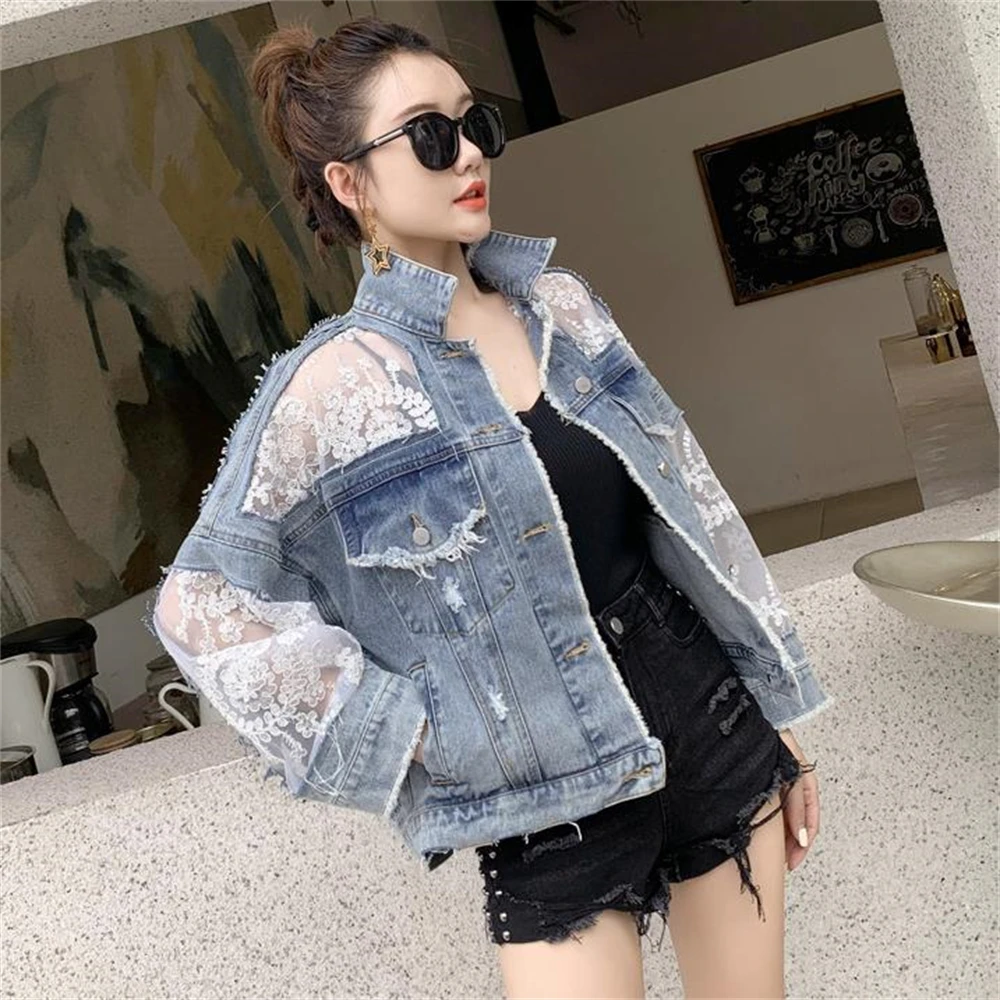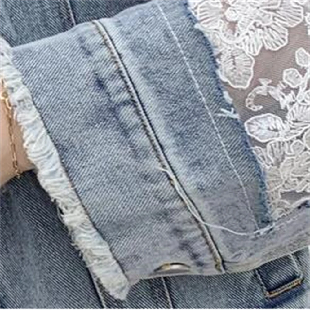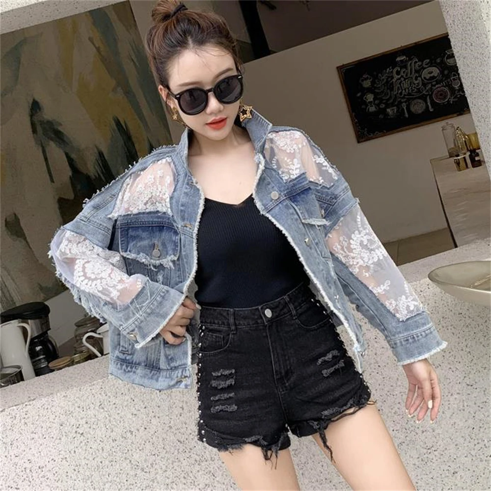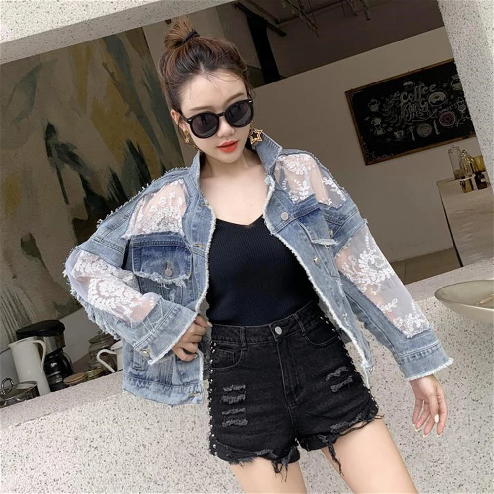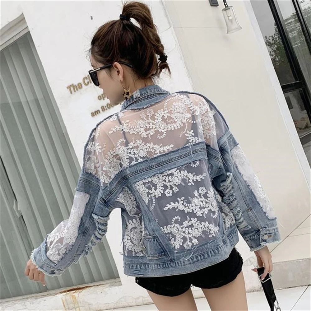 Denim Jacket Women Casual Long Sleeve Coat Lace Patchwork Jeans Tops Women Sexy Perspective Embroidery Flower Outerwear Spring