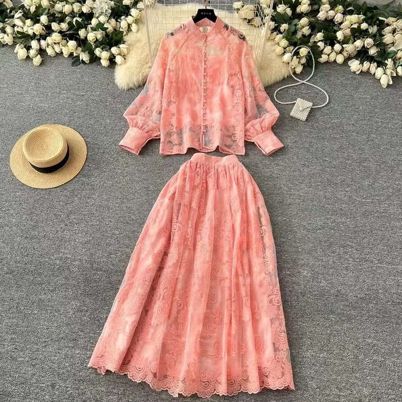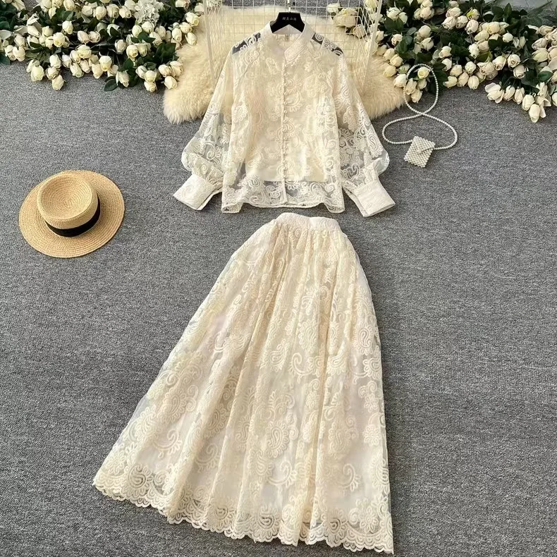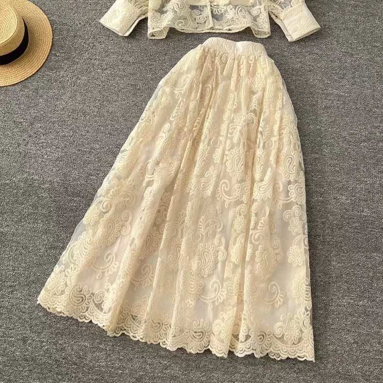 Elegant 2 Piece Long Dress Women Skirt Set Summer Autumn Flower Embroidery Hollow Out Lace Shirt A Line Midi Skirt Party Dresses