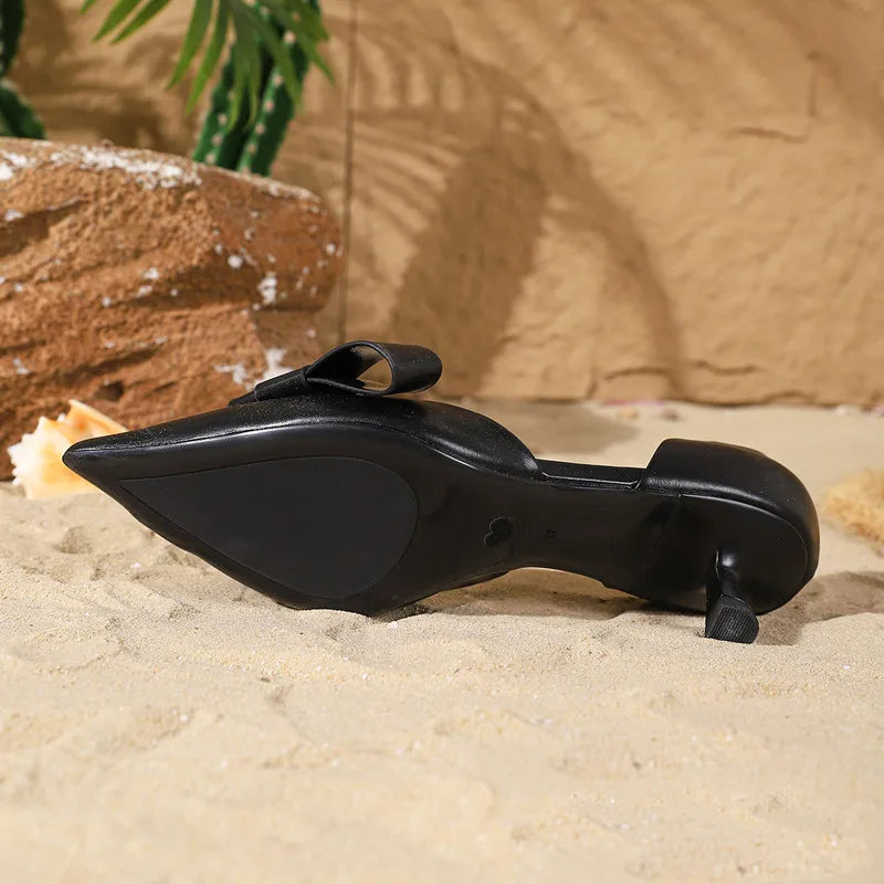 Elegant Black Pointed Toe High Heels Women Fashion Shallow Bow Kitten Heel Designer Shoes Comfortable Soft Leather Office Shoes