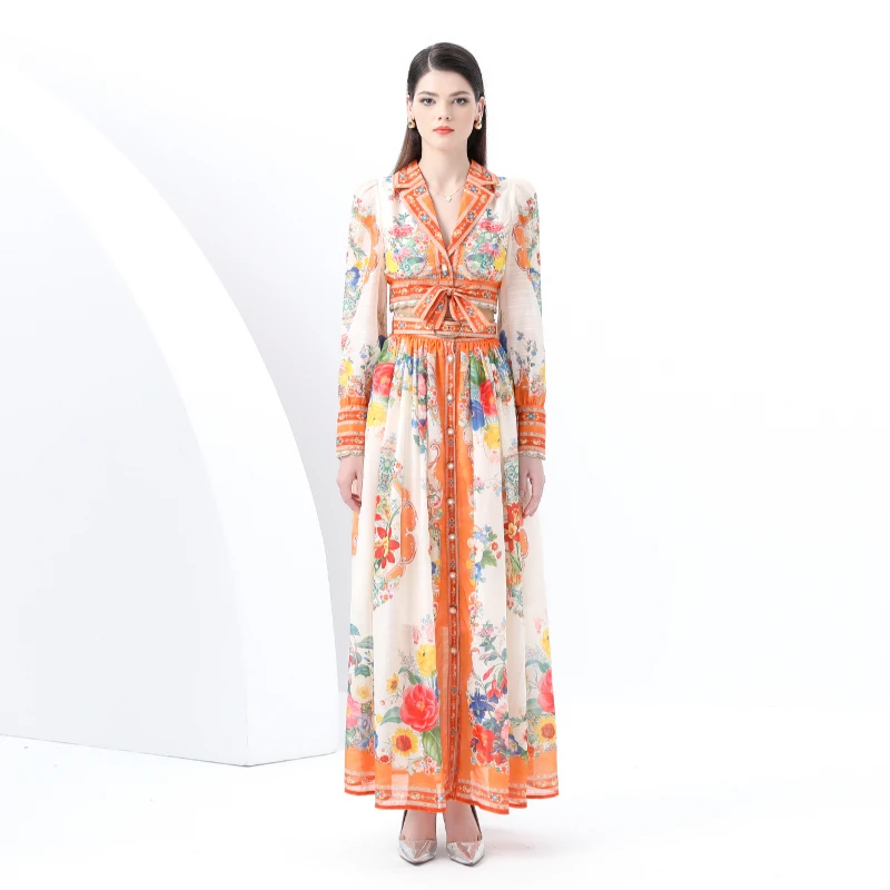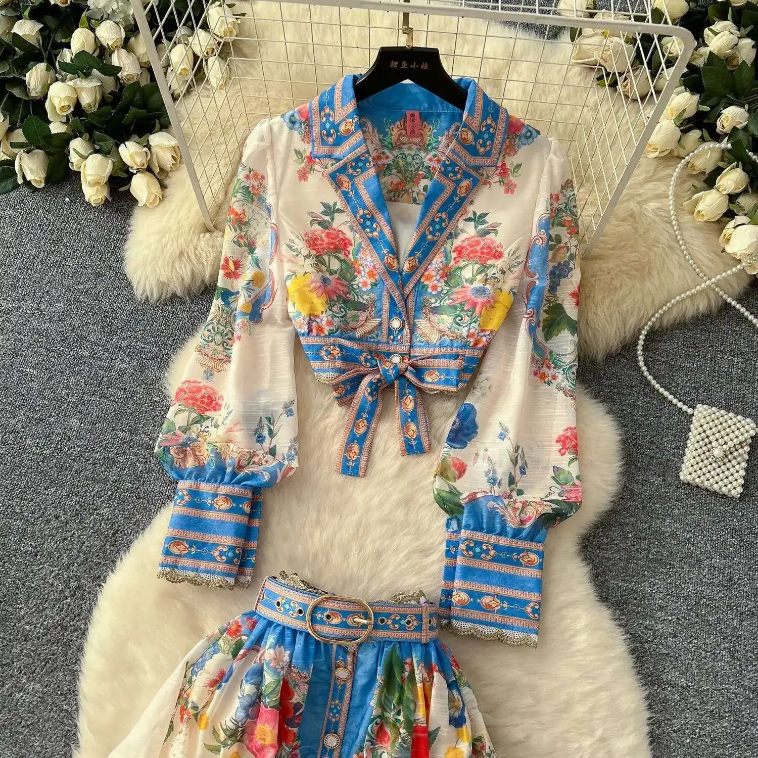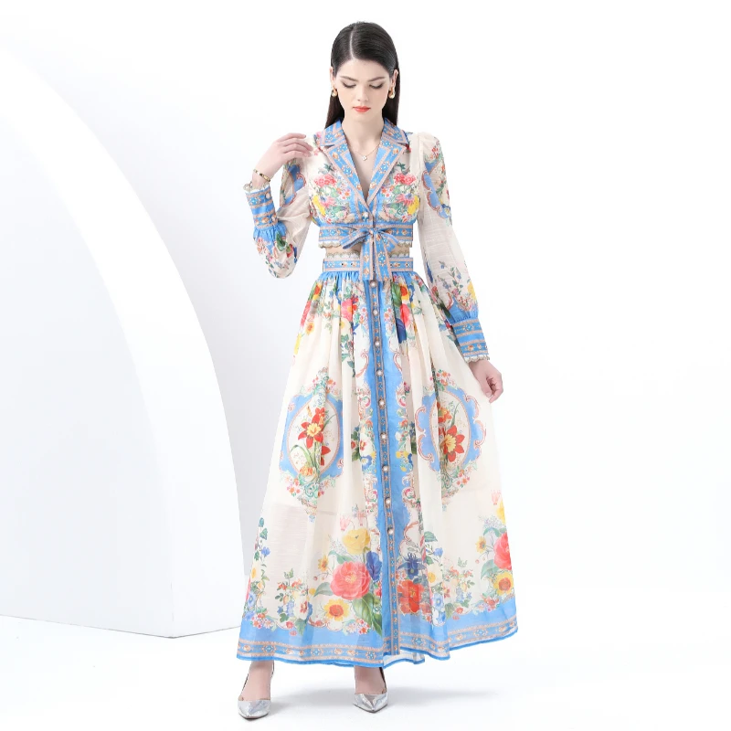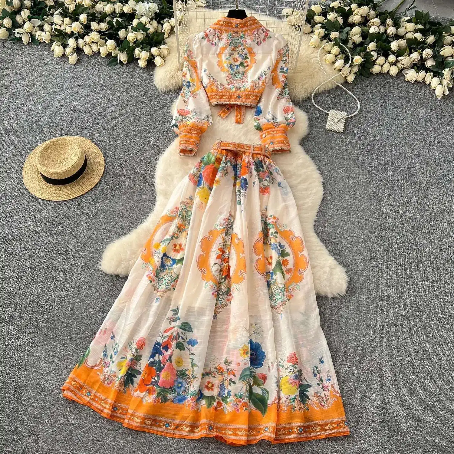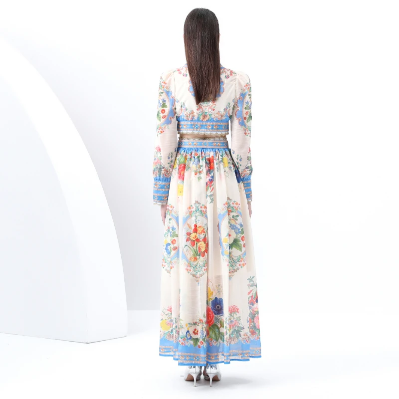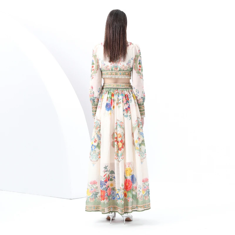 Elegant Floral Maxi Dress 2 Piece Skirt Sets Women Summer Autumn Palace Crop Top Print Shirt A Line Long Skirts Beach Outfit