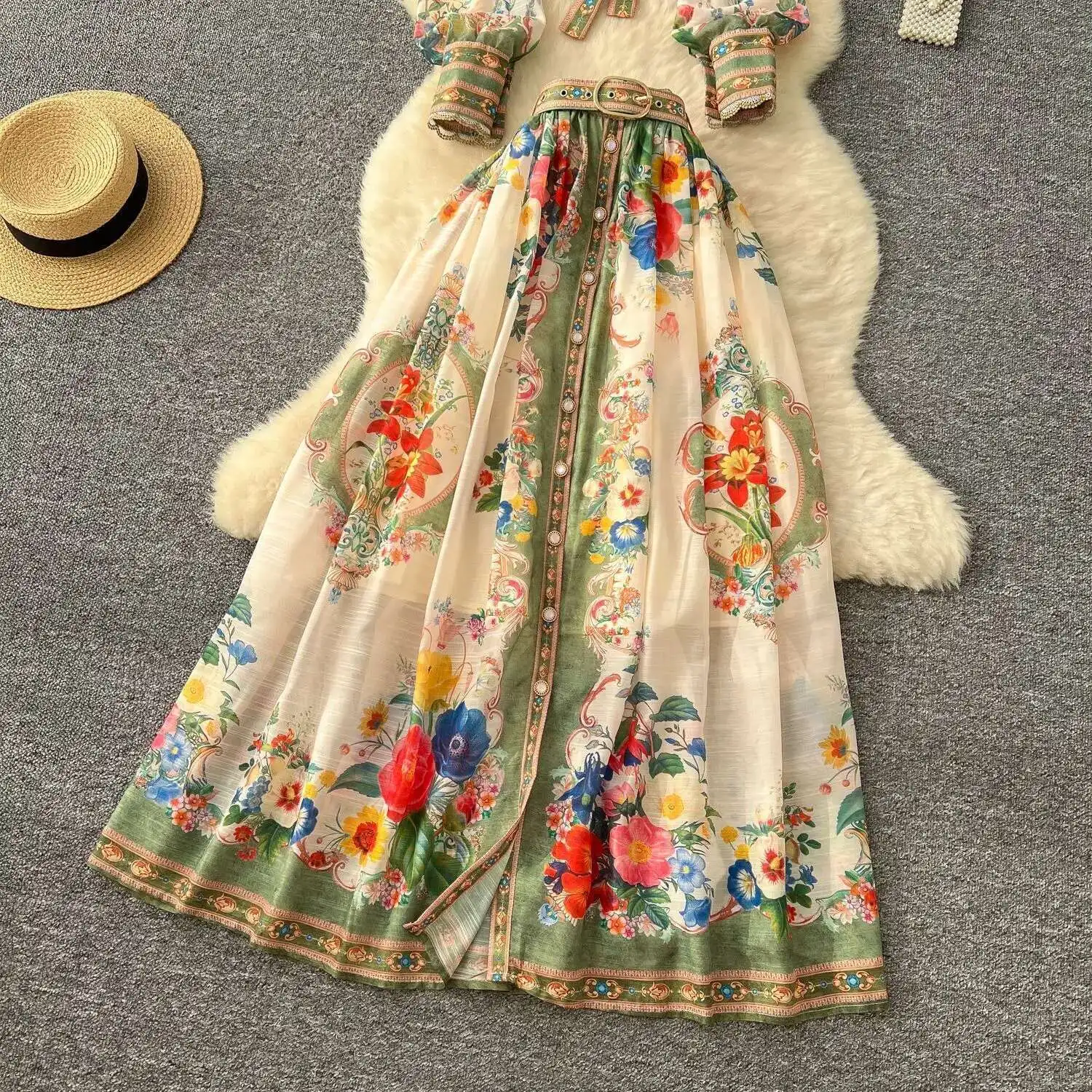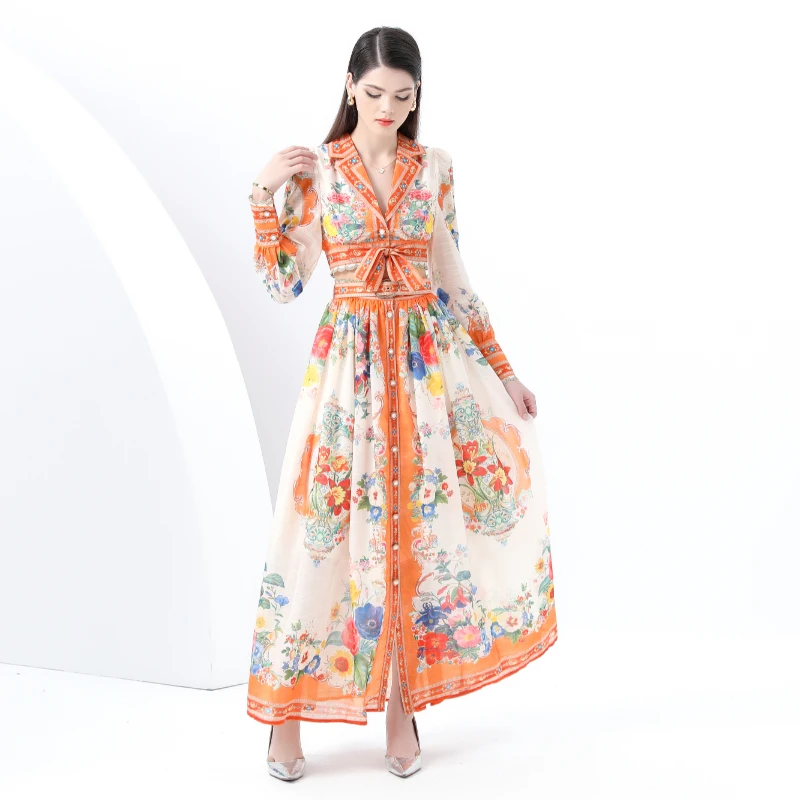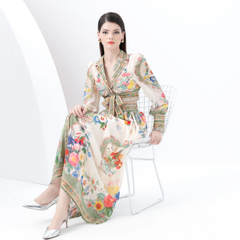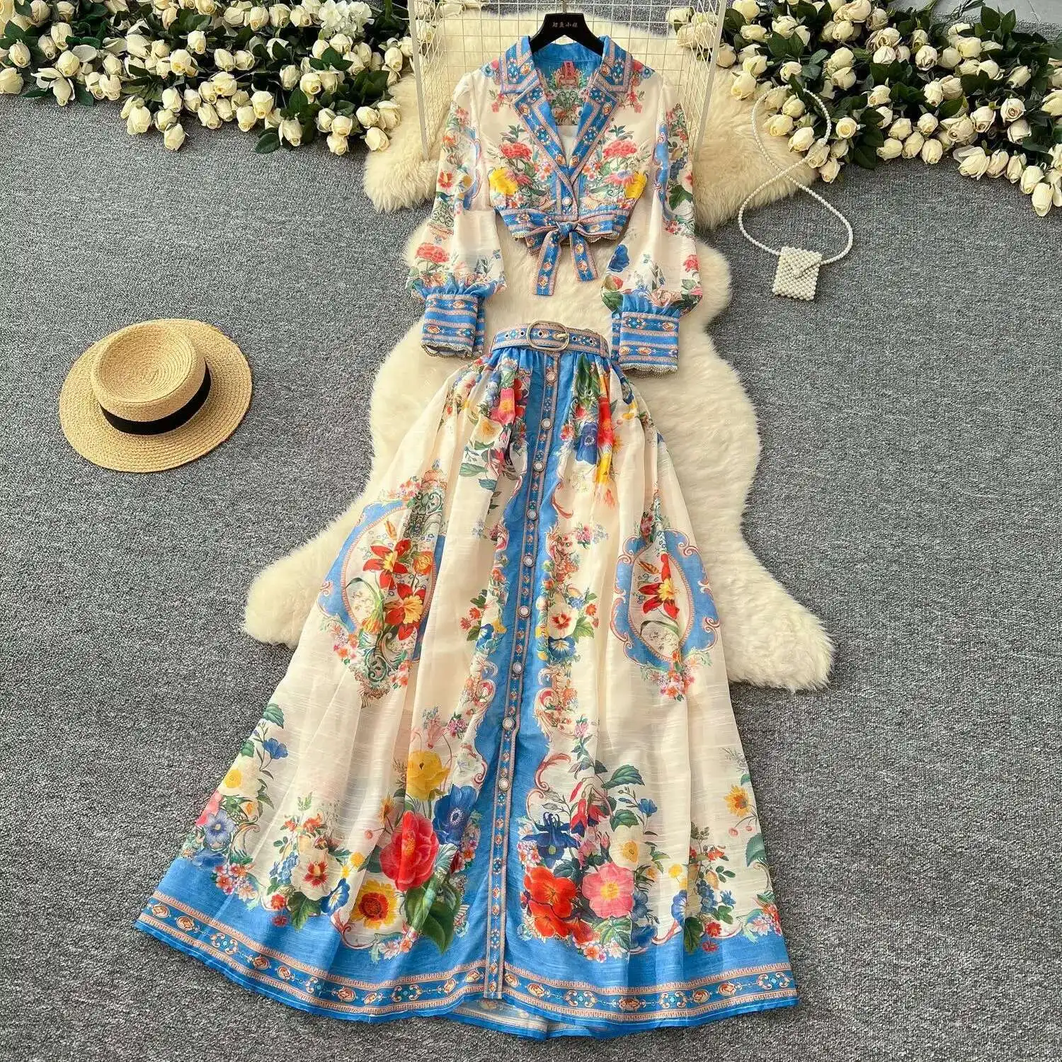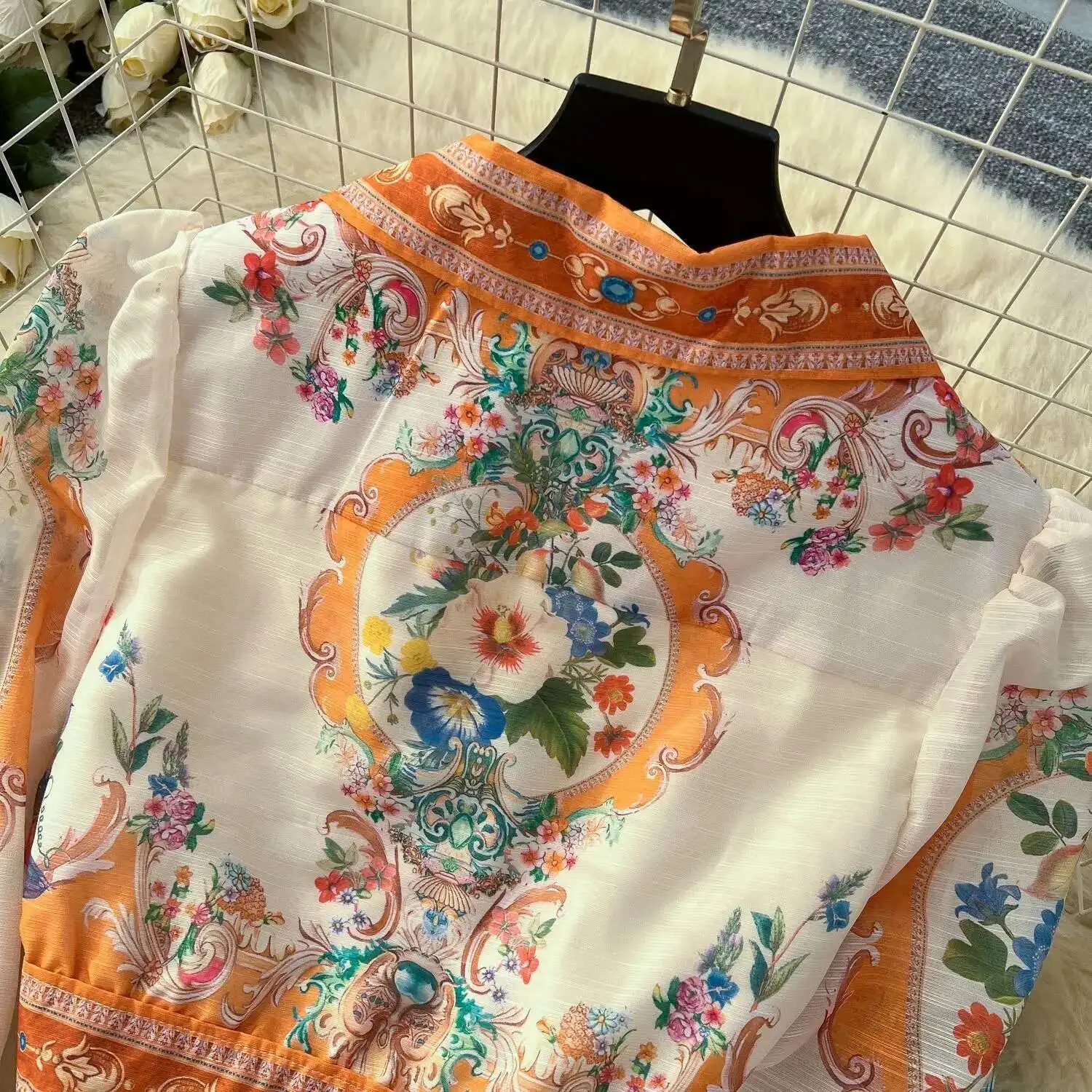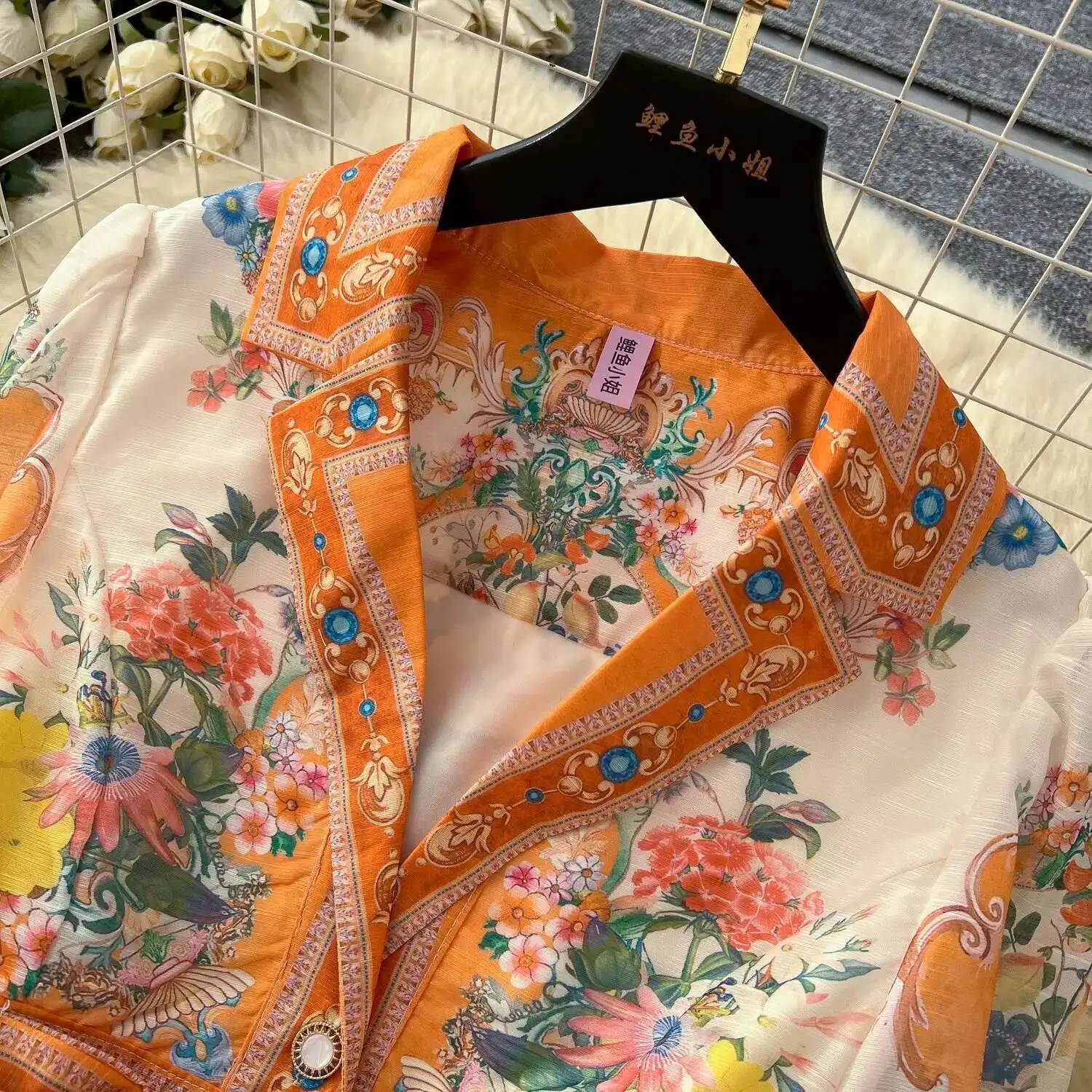 Elegant Floral Maxi Dress 2 Piece Skirt Sets Women Summer Autumn Palace Crop Top Print Shirt A Line Long Skirts Beach Outfit