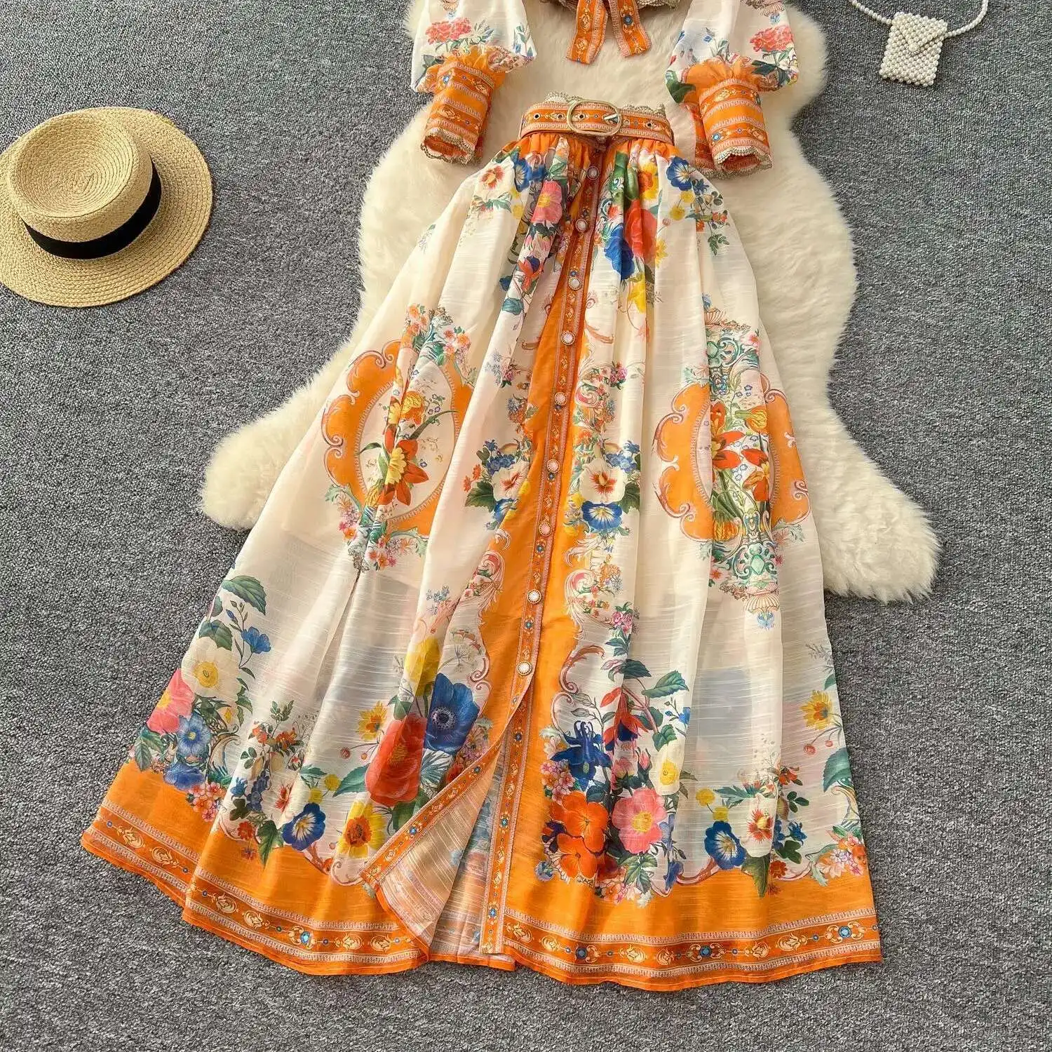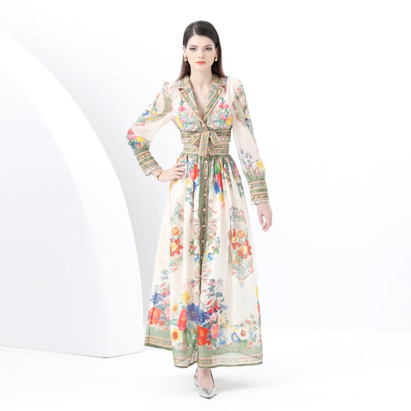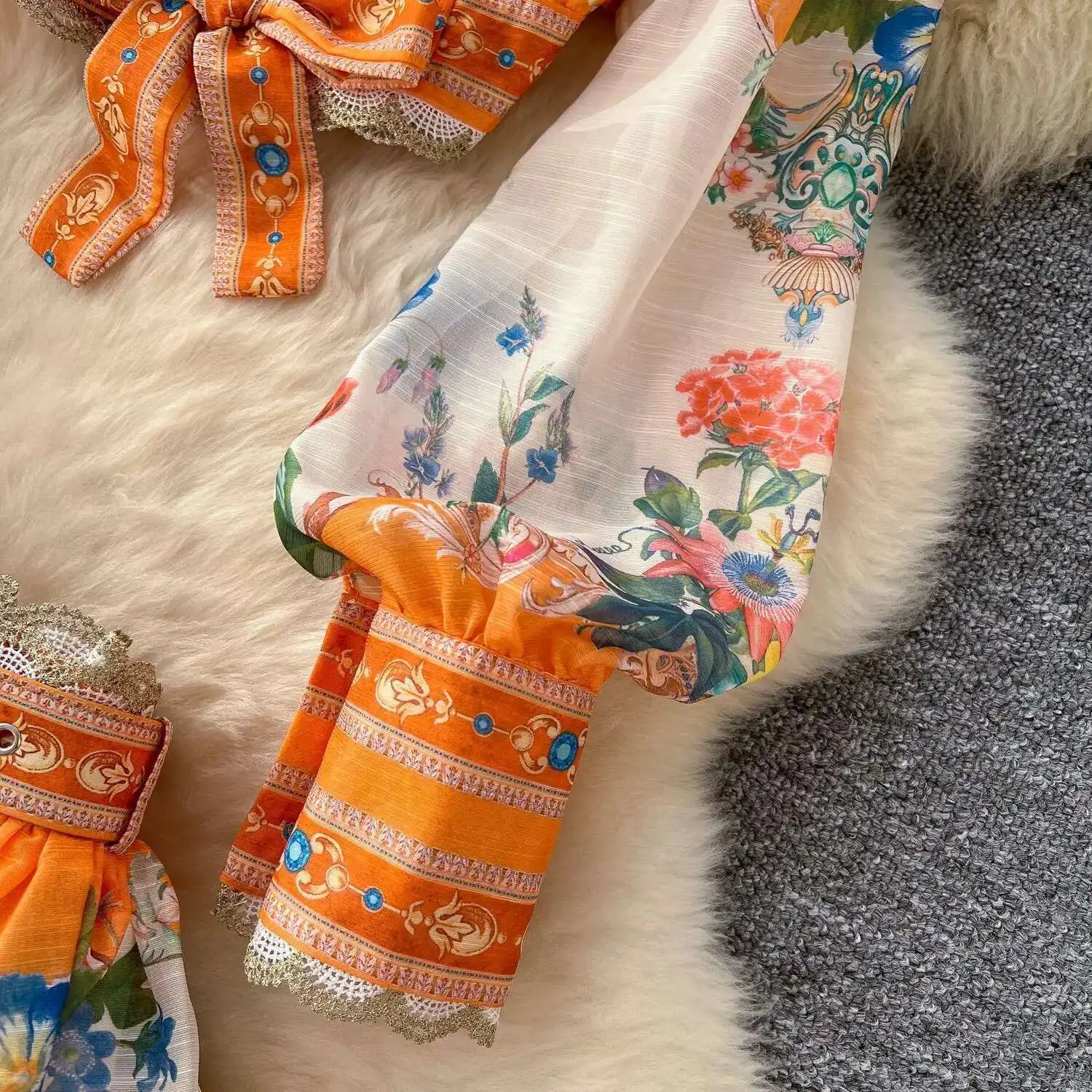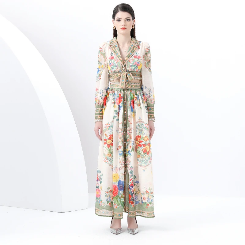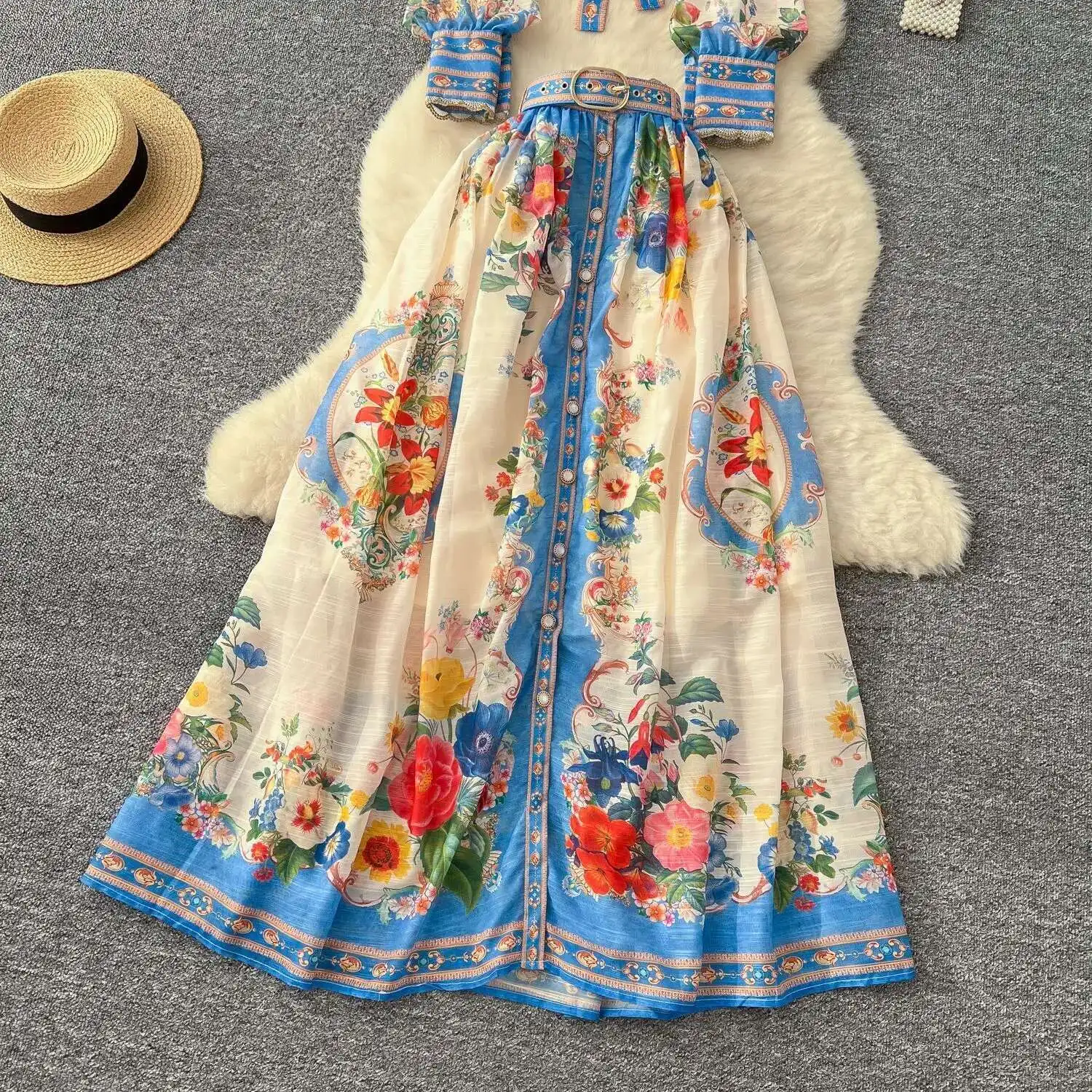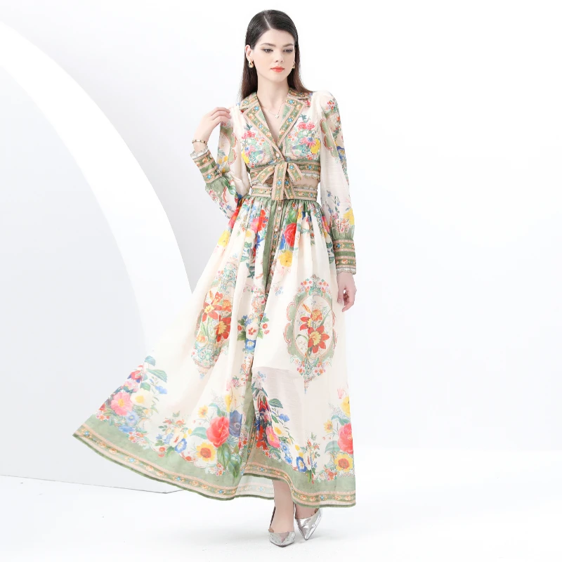 Elegant Floral Maxi Dress 2 Piece Skirt Sets Women Summer Autumn Palace Crop Top Print Shirt A Line Long Skirts Beach Outfit