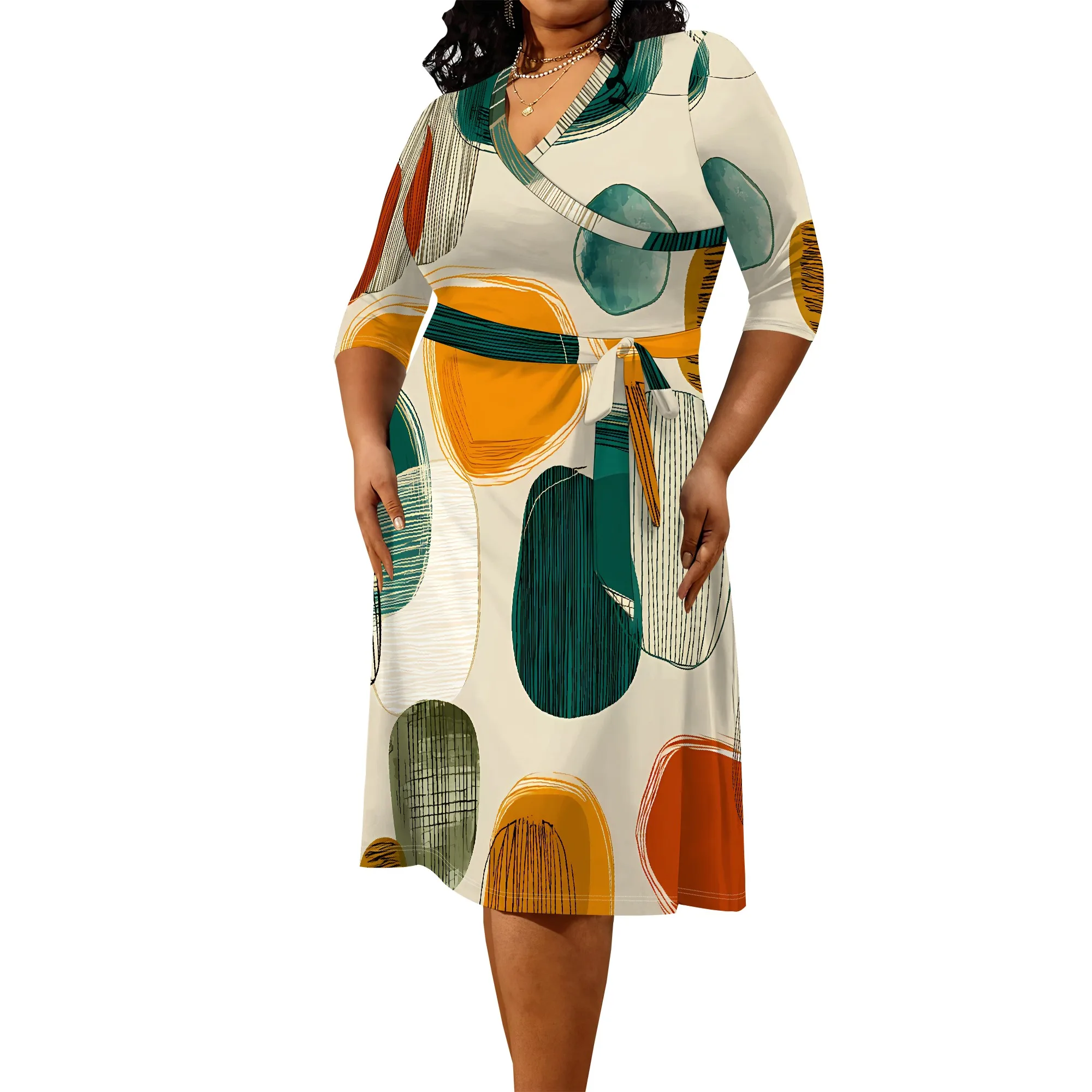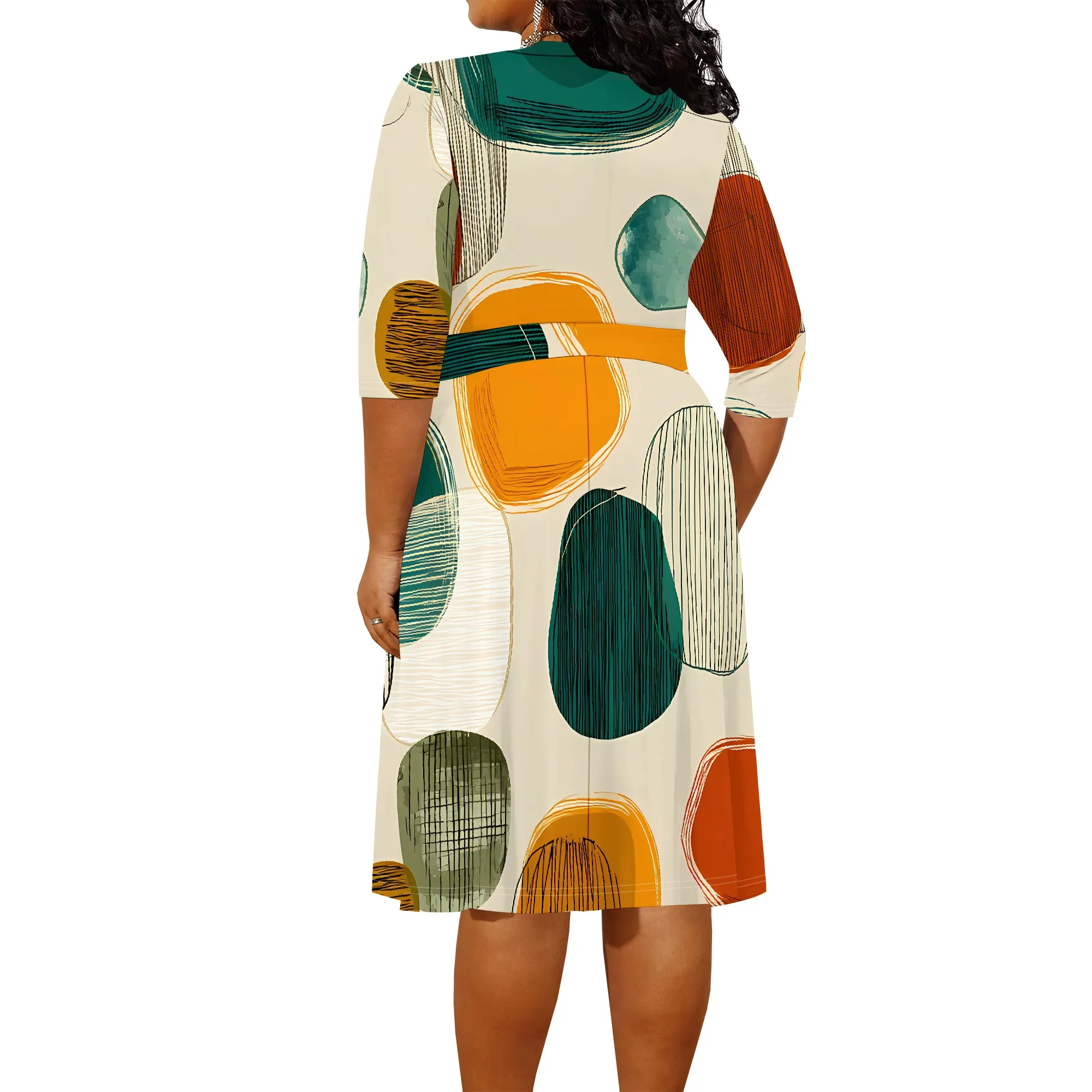 Plus Size V-Neck Wrap Midi Dress Abstract Dot Print Artistic Style Half Sleeve Summer Look